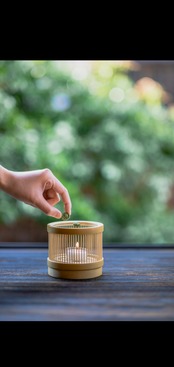 冬の明け方、宇治川の川霧が薄らいでゆくのと共に、網代木の列が徐々に姿を現した情景を、香炉で表現しました。(竹材には防炎加工済み)